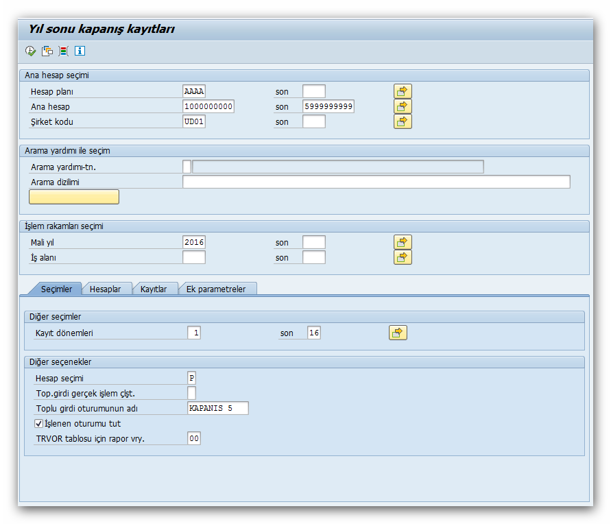 Dönem sonu kapanış ve dönem başı açılış için 2 adet belge türü tanımlanır. Şirket bağımsız olarak ZA(Açılış Belge Türü) – ZK (Kapanış Belge Türü) belge türleri tanımlı olabilir. Şirketten şirkete belge türleri tanımları değişkenlik gösterir. Akabinde f-02 ve fb50 işlem kodlarından kayıt ve belge tarihi 31.12.2016 dönem 13 ve kapanış işlemleri için tanımlanan ZK belge türü kullanılarak yapılır.