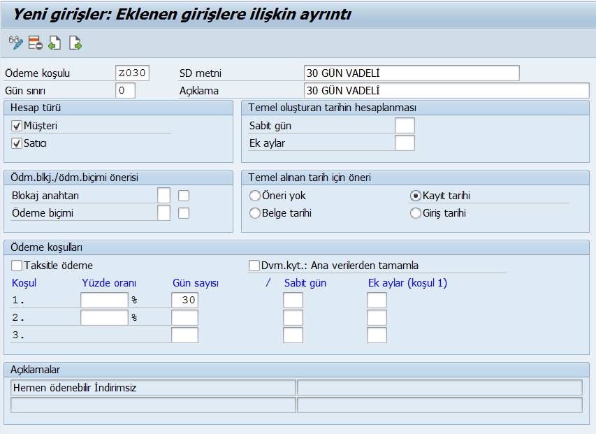 Menü Yolu: SPRO / Mali Muhasebe (yeni) / Müşteriler ve Satıcılar Muhasebesi / Ticari İşlemler / Fatura Girişi / Alacak Dekontu Girişi / Ödeme Koşullarının Bakımı